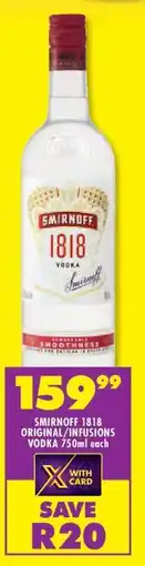 | SMIRNOFF 1818 ORIGINAL/INFUSIONS VODKA 750ml | Shoprite | R 154,99 | 20 October 2025 | 02 November 2025 | |||