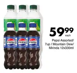 Save Hyper Ppepsi Assorted/ Mountain Dew/ 7up/ Mirinda Cooldrink offerPpepsi Assorted/ Mountain Dew/ 7up/ Mirinda Cooldrink 2 x 12 x 330 mlSave HyperR 115,0029 December 202511 January 2026