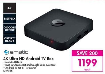 | Ematic - 4K Ultra HD Android TV Box | Makro | R 1 199,00 | 30 May 2022 | 05 June 2022 | |||