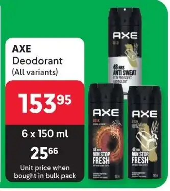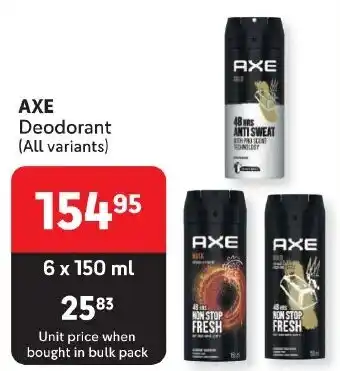 Makro Axe deodorant (all variants)-for 3 x 150ml offerAxe deodorant (all variants)-for 3 x 150mlMakroR 95,0002 October 202328 January 2024