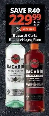 | Bacardi Carta Blanca/ Negra Superior Rum 750 ml | Checkers | R 239,99 | Save R40 | 19 May 2025 | 08 June 2025 | ||