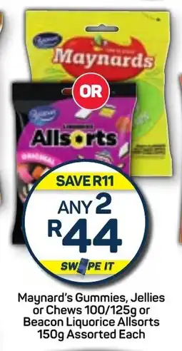 | Maynard's Gummies, Jellies or Chews Assorted 100/125 or Beacon Liquorice Allsorts 150g | Pick n Pay | R 40,00 | 07 July 2025 | 23 July 2025 | |||
