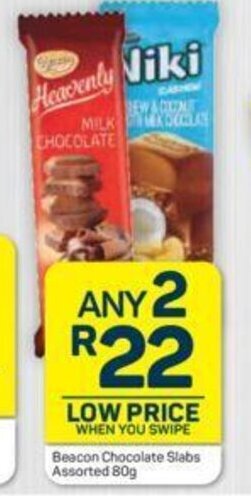 | Beacon Chocolate Slabs Assorted 80g | Pick n Pay | R 22,00 | Any 2 for R22 | 09 May 2022 | 22 May 2022 | ||