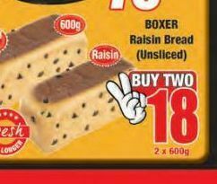 | Boxer Raisin Bread (Unsliced) 2x600g | Boxer | | R 18,00 | | 19 December 2021 | 08 January 2022 |