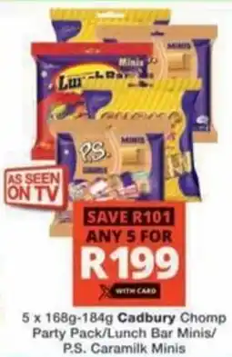 | Cadbury Chomp Party Pack/ Lunch Bar Minis/ P.S. Caramilk Minis | Checkers Hyper | R 300,00 | R 199,00 | Save R101 | 19 January 2026 | 08 February 2026 | |
