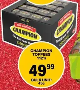 Have a taste of the South African heritage in a toffee by sharing Champion toffees. Champion is known for its rich taste and smooth textured caramel toffees. You can snack on a quality chew by shopping for Champion toffee blocks and sweets that are full of flavour. Scroll through these Cataloguespecials brochures to find bulk Champion toffee deals and Campion flavours. You can save from Champion offers such as Champion Toffee Bag Original 1 x 1k offers, Champion Toffees 112s pack - Cola offers, Champion Toffees 108 x 85g Banana offers, Champion Toffee Bag Buttermilk 1 x 918g offers, Champion Toffee Bag Fruit Punch 1 x 918g offers and also Champion Strawberry & Cream Flavoured Toffee 112s x 6 pack offers. You can find your cheapest Champion deals by shopping from Sweet City, Makro, Checkers, Game, Boxer, Kit-Kat Cash & Carry, Albatross Wholesale and Sweet Zone. For bulk purchases, shop for Champion Toffee deals online from Takealot and other retailers to save and get free delivery deals on your Champion offers to your doorstep.