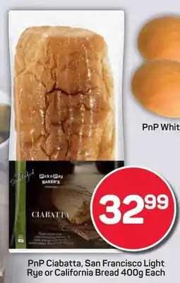 Pick n Pay PnP San Francisco Light Rye, Ciabatta or California Bread 400g Each offerPnP San Francisco Light Rye, Ciabatta or California Bread 400g EachPick n PayR 32,9924 November 202530 November 2025