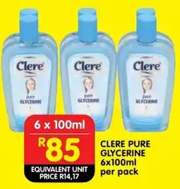 | 2 | Clere pure glycerine 6 x 100 ml | Shoprite | R 85,00 | 22 December 2025 | 04 January 2026 | View offer | |||