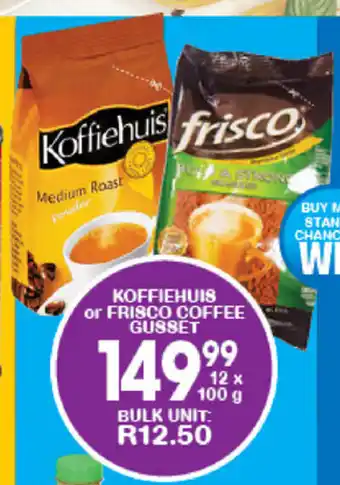 | Koffiehuis or Frisco Coffee Gusset 12x100g | Giant Hyper | R 149,99 | 13 August 2021 | 05 September 2021 | |||