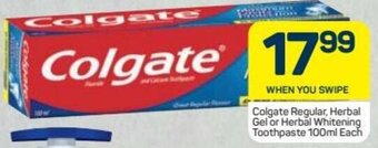 | Colgate Regular, Gel, Herbal or Herbal Whitening Toothpaste 100 ml | Pick n Pay | R 21,99 | Save R8 | 07 October 2024 | 22 October 2024 | ||