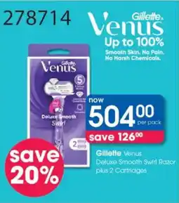 | Gillette Venus Deluxe Smooth Swirl Razor plus 2 Cartridges | Clicks | R 630,00 | R 504,00 | Save 126 | 12 January 2026 | 21 January 2026 | |