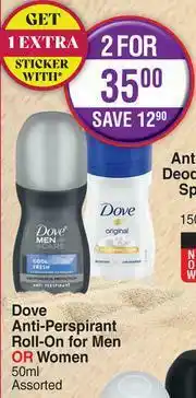 | Dove anti-prespirant roll-on for men or women assorted-for 1 x 50ml | Dis-Chem | R 28,95 | 15 June 2023 | 09 July 2023 | |||