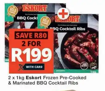 | 2 x 1kg Eskort Frozen Pre-Cooked & Marinated BBQ Cocktail Ribs | Checkers Hyper | R 199,00 | SAVE R80 | 20 May 2024 | 09 June 2024 | ||