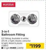 | Eurolux 3 In 1 Bathroom Fitting (2 Lights) | Builders Warehouse | R 1 199,00 | 30 March 2021 | 24 May 2021 | |||