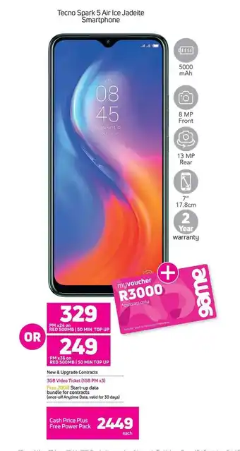 | 2 x Tecno Spark 5 Air Ice Jadeite Smartphone-On uChoose Flexi 125 Plus Free On Promo 65 | Game | R 199,00 | 21 April 2021 | 06 June 2021 | |||