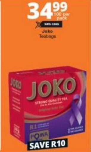 | Joko Strong Quality Teabags | Checkers | R 54,99 | Save 13% | 20 October 2025 | 09 November 2025 | ||