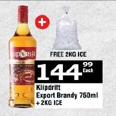 | Klipdrift Export Brandy 750ml + 2kg Ice | Oxford Freshmarket | R 144,99 | 22 June 2021 | 28 June 2021 | |||