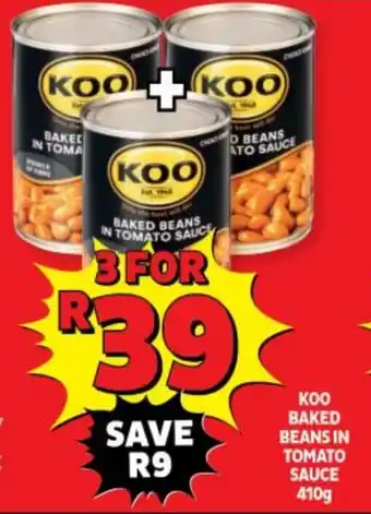 | КОО BAKED BEANS IN TOMATO SAUCE 410g | Usave | R 39,00 | SAVE R9 | 16 November 2023 | 19 November 2023 | ||