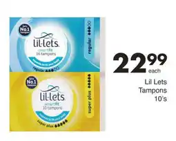 | 1 | Lil Lets Tampons 10's | Save | R 22,99 | 15 January 2026 | 25 January 2026 | View offer | |||