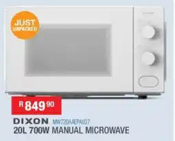 | Dixon 700w manual microwave | Cash Crusaders | R 849,90 | 01 December 2025 | 24 December 2025 | |||