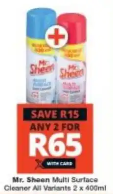 | Mr. Sheen Multi Surface Cleaner All Variants 2 x 400ml | Checkers | R 65,00 | Save R15 | 08 April 2024 | 21 April 2024 | ||