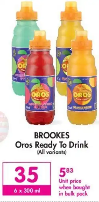 | BROOKES Oros Ready To Drink (All variants) 6 x 300 ml | Makro | R 90,00 | 31 July 2023 | 01 October 2023 | |||