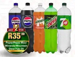 | PEPSI/MIRINDA/MOUNTAIN DEW SOFT DRINK 2L | Shoprite | R 34,00 | 11 December 2025 | 14 December 2025 | |||