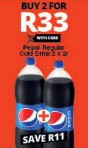 | Pepsi Regular Cold Drink 2 x 2 L | Checkers | R 35,00 | Save R11 | 21 October 2024 | 10 November 2024 | ||