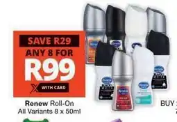 | Renew Roll-On for Ladies/ Men | Checkers | R 22,00 | Save R10 | 11 August 2025 | 24 August 2025 | ||