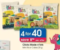 | Clicks Made 4 Tots Mini Rice Cakes 4 x 20 g | Clicks | R 48,96 | R 40,00 | Save 8.96 | 30 December 2025 | 12 January 2026 | |