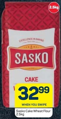 | Sasko Cake Wheat Flour 2.5 kg | Pick n Pay | R 35,99 | Save R11 | 22 August 2024 | 08 September 2024 | ||