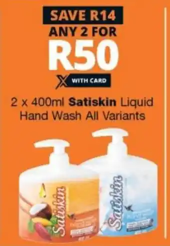 | Satiskin Hand Wash All Variants 2 x 475 ml | Checkers | R 75,00 | Save R23 | 23 October 2025 | 09 November 2025 | ||