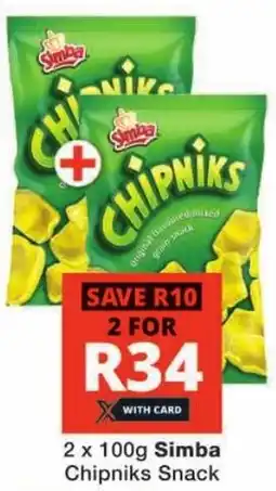 | 2 | Simba Chipniks Snack 2 x 100 g | Checkers | R 44,00 | R 34,00 | Save R10 | 08 December 2025 | 28 December 2025 | View offer | |