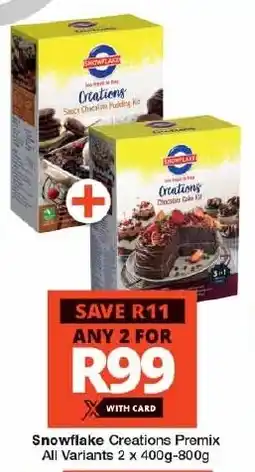 | Snowflake Creations Premix All Variants 2 x 400 g and 800 g | Checkers | R 99,00 | Save R11 | 29 August 2024 | 01 September 2024 | ||