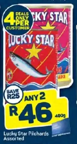 Pick n Pay Lucky Star Pilchards in Sauce Assorted 400g offerLucky Star Pilchards in Sauce Assorted 400gPick n PayR 48,00SAVE R1107 August 202421 August 2024