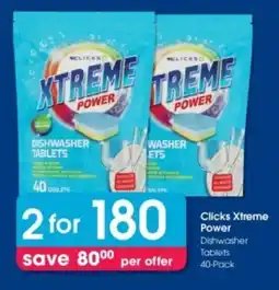 | Clicks Xtreme Power Dishwasher Tablets | Clicks | R 180,00 | Save 80 | 21 May 2025 | 04 June 2025 | ||