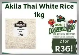 | 2 | Akila Thai White Rice 2 x 1 kg | Foodeez | R 36,00 | 12 January 2026 | 18 January 2026 | View offer | |||