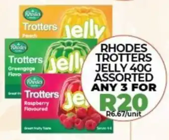 This special is available in various stores, view all products to get the cheapest Rhodes trotters jelly assorted. If you'd like to find out whether this product has a bigger discount in another store, check the category 'Wholesale'. You may also find these specials interesting: Rhodes Trotters Jelly Assorted, Rhodes Trotters Jelly Assorted & Rhodes Trotters Jelly 40 g Assorted.