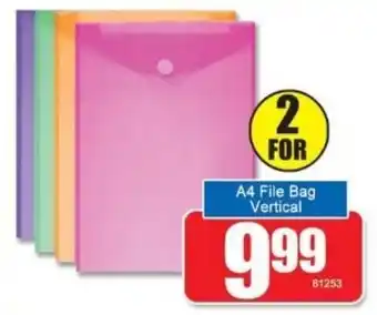 This special is available in various stores, view all products to get the cheapest A4 File Bag Vertical. If you'd like to find out whether this product has a bigger discount in another store, check the category 'Grocery stores'. You may also find these specials interesting: Business File Bag A4, File Bag A4 Assorted Colours & A4 File Bag Asstd. Colours.