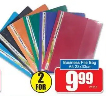 This special is available in various stores, view all products to get the cheapest Business File Bag A4. If you'd like to find out whether this product has a bigger discount in another store, check the category 'Grocery stores'. You may also find these specials interesting: A4 File Bag Vertical, File Bag A4 Assorted Colours & A4 File Bag Asstd. Colours.