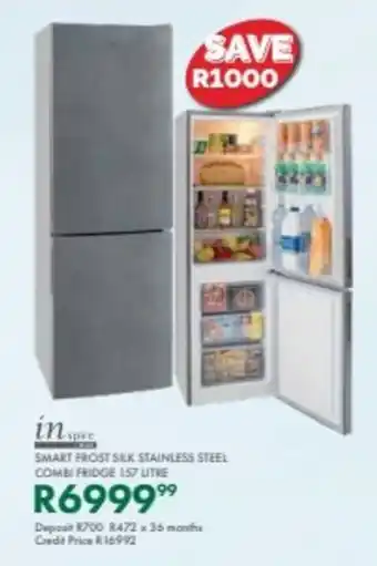 This special is available in various stores, view all products to get the cheapest Inspire smart frost silk stainless steel combi fridge. If you'd like to find out whether this product has a bigger discount in another store, check the category 'Kitchen & Bathroom'. You may also find these specials interesting: Russell hobbs smart frost water dispenser stainless steel fridge, Inspire stainless steel pack & Inspire stainless steel appliance pack.