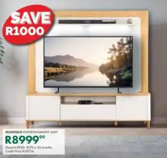 This Munique entertainment unit is currently available as part of a special promotion at Beares. Be sure to check the current promotions filled with competitive prices and deals. You can order Munique entertainment unit online via Beares website or get it at the best available price. Cataloguespecials.co.za collects the most relevant Munique entertainment unit offers and specials for you. Want to be notified first? Click the bell icon to receive a free alert when the product is part of a new promotion or available again.
