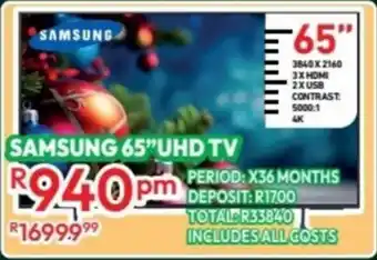 This special is available in various stores, view all products to get the cheapest Samsung 65" UHD TV. If you'd like to find out whether this product has a bigger discount in another store, check the category 'Home furniture'. You may also find these specials interesting: Samsung 70" UHD Smart TV, Samsung 65" UHD Smart TV & Samsung 55" UHD Smart TV.