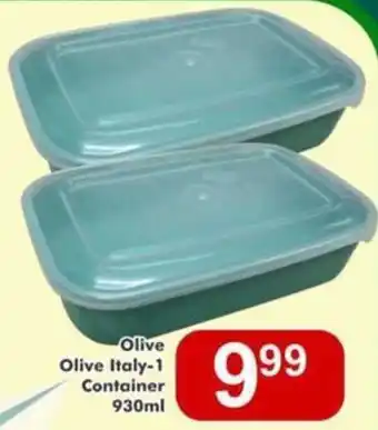 This special is available in various stores, view all products to get the cheapest Olive Italy-1 Container. If you'd like to find out whether this product has a bigger discount in another store, check the category 'Wholesale'. You may also find these specials interesting: Olive Classic 1 Container, Olive Pride Blended Olive Oil & Olive Pouches.