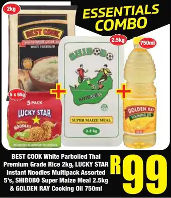 BEST COOK White Parboiled Thai Premium Grade Rice 2kg, LUCKY STAR Instant Noodles Multipack Assorted 5's, SHIBOBO Super Maize Meal 2.5kg & GOLDEN RAY Cooking Oil 750ml