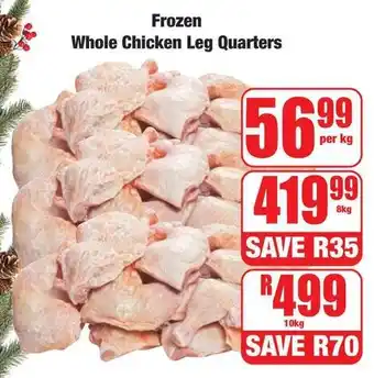 This special is available in various stores, view all products to get the cheapest Frozen Whole Chicken Leg Quarters. If you'd like to find out whether this product has a bigger discount in another store, check the category 'Grocery stores'. You may also find these specials interesting: Frozen Whole Chicken Leg Quarters, Frozen Whole Chicken Leg Quarters 4kg & HINDS Spice Assorted (All Sizes) & no name Frozen Chicken Leg Quarters 3.5kg.