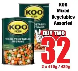 The price of KOO Mixed Vegetables Assorted can be found at the top of the page, together with the dates during which the special is available. You can also check the price in the current Boxer Superstores catalogue or on the Boxer Superstores website. Promotional offers assure you of buying Boxer Superstores products at the lowest price.