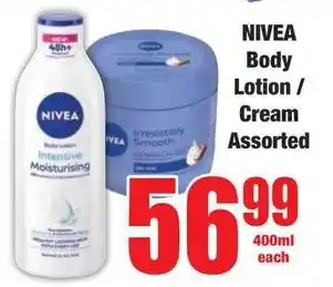 This special is available in various stores, view all products to get the cheapest NIVEA Body Lotion/ Cream Assorted. If you'd like to find out whether this product has a bigger discount in another store, check the category 'Grocery stores'. You may also find these specials interesting: NIVEA Body Lotion/ Cream Assorted, Nivea Body Lotion or Cream Assorted & Nivea Body Lotion or Cream Assorted 400ml Each.