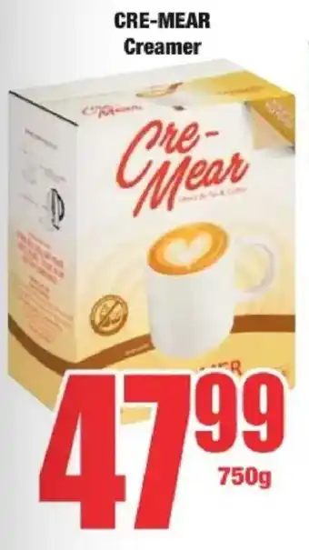 This special is available in various stores, view all products to get the cheapest CRE-MEAR Creamer. If you'd like to find out whether this product has a bigger discount in another store, check the category 'Grocery stores'. You may also find these specials interesting: CRE-MEAR Creamer, CRE-MEAR Creamer 750g & NESCAFÉ Ricoffy Instant Coffee 250g / Pouch Value Pack 280g & Nestle Cremora Creamer.