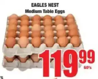 This special is available in various stores, view all products to get the cheapest EAGLES NEST Medium Table Eggs. If you'd like to find out whether this product has a bigger discount in another store, check the category 'Grocery stores'. You may also find these specials interesting: Nulaid taxi pack eggs medium, Large Eggs & Large Eggs.
